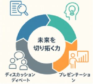 このクラスでは、英語を「日常の言葉」から「学問を探究する言語」へと発展させ、実社会や学問的テーマをもとにリサーチから発表までを英語で行います。その学びは、リサーチ・思考・対話・発表が循環するサイクル型プログラムで、発見と表現をくり返す中で思考力と表現力を深めていきます。