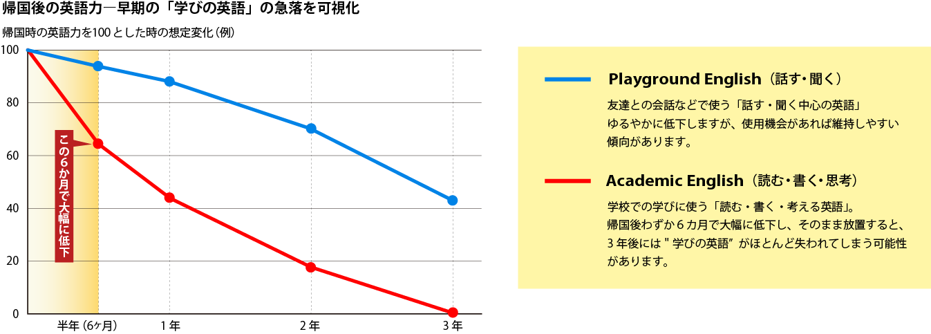 どちらも大切ですが、帰国後に失われやすいのはAcademic Englishです。 実際、複数の研究では「帰国後3年で日常会話力の多くが失われる可能性」が指摘されています。 特に小学校低学年で帰国した場合、継続的な英語環境がなければ、 英語が「読む・聞く」に偏り、「考えて表現する英語力」が急速に弱まる傾向があります。