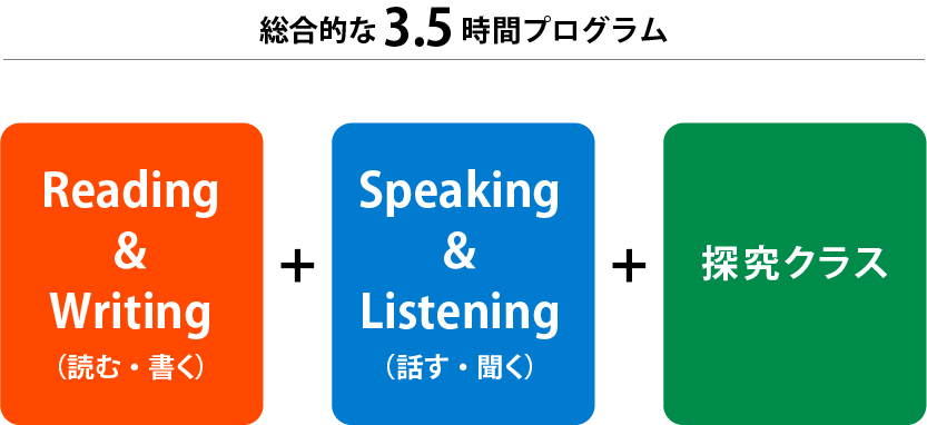 ESL College では、Reading & Writing / Speaking & Listening / 探究クラス を組み合わせた 総合的な 3.5時間プログラム を提供。(中高生は2時間プログラムになります)