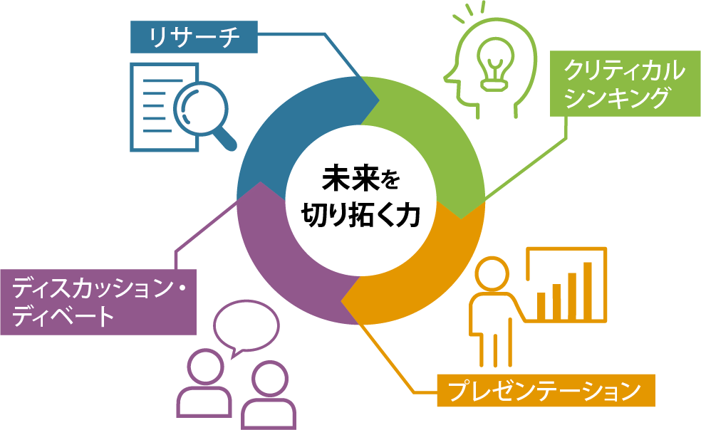 このクラスでは、英語を「日常の言葉」から「学問を探究する言語」へと発展させ、実社会や学問的テーマをもとにリサーチから発表までを英語で行います。その学びは、リサーチ・思考・対話・発表が循環するサイクル型プログラムで、発見と表現をくり返す中で思考力と表現力を深めていきます。