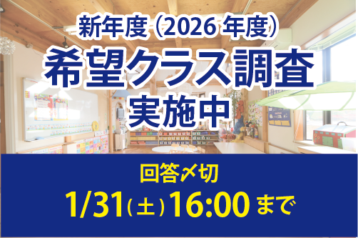 2026年度の希望クラス調査中 2026年度の希望クラス調査のお願いをメールでみなさまに送信しております。 回答〆切:1/31(土)16:00まで
