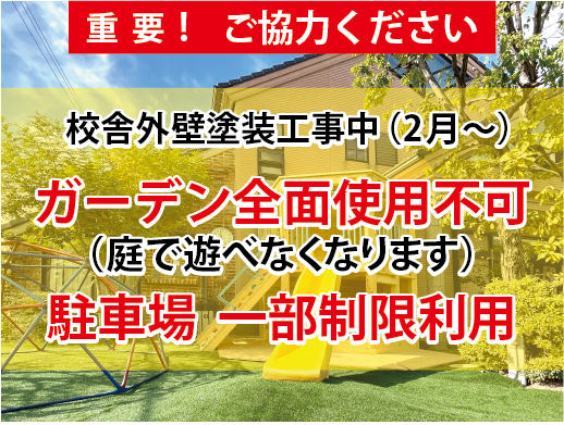 校舎外壁塗装工事および駐車場・ガーデン利用制限について この度、校舎本館の外壁塗装工事を下記の期間で実施いたします。 工事期間中は、駐車場およびガーデン